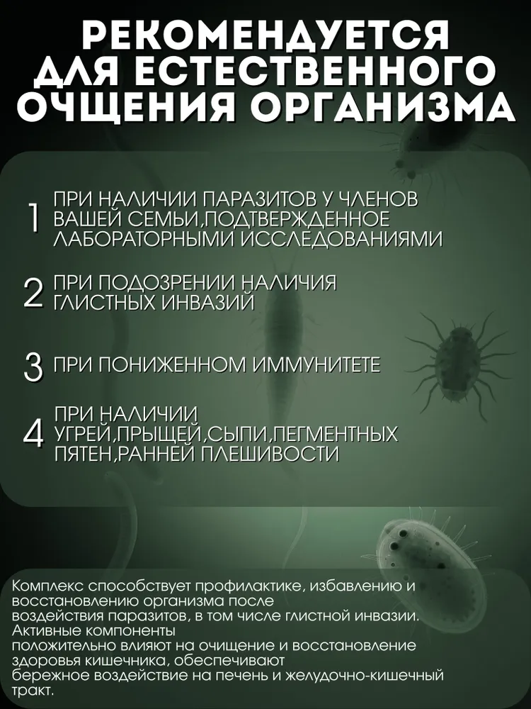 Средство также имеет профилактическое действие. Его регулярное применение помогает защищать организм от повторного заражения паразитами, укрепляет иммунитет и нормализует работу желудочно-кишечного тракта, снижая риск развития хронических заболеваний и интоксикации.